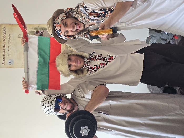 An indoor, waist-up portrait captures three adult males in Sofia, Bulgaria, positioned in a line and enthusiastically facing the camera against a plain light-colored wall. A beige-toned poster on the wall displays Cyrillic text, including "АПОСТОЛА НА СВОБОДАТА" (THE APOSTLE OF FREEDOM) and "150 години безсмъртие" (150 years of immortality), a reference to a Bulgarian national hero. The leftmost male wears a light-colored tunic, a white and black checkered keffiyeh-style headscarf, and blue-tinted reflective sports sunglasses. He holds a black dumbbell with silver plates aloft in his left hand, smiling broadly with his tongue extended. The middle male wears a white shirt featuring prominent red and black traditional embroidery on the chest and collar, paired with a beige fur ushanka-style hat. He holds a small Bulgarian flag, mounted on a gray collapsible pole with a red plastic shovel-like object attached to its top, raised above his head. He also smiles widely with his tongue extended. The rightmost male wears a light-colored tunic and a beige safari-style hat with a multi-patterned scarf draped over it and around his neck. He holds a translucent amber-colored rectangular object in his raised right hand. He exhibits a broad, open-mouthed smile, showing his teeth. All three subjects appear joyful and engaged. The lower portion of the image shows dark, rumpled fabric and clothing, indicating a casual indoor setting, likely a residence or recreational space.