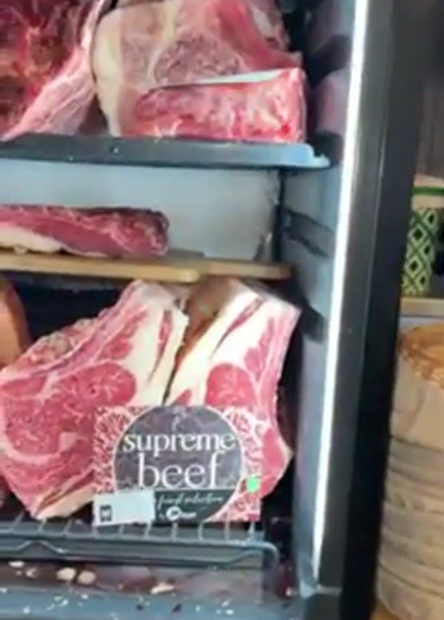 refrigerator display case filled with cuts of raw beef. The cuts include ribeyes and larger roasts, some labeled "Supreme Beef." The meat is bright red with significant marbling of fat. The top shelves contain dry-aged beef, and there are some ice crystals visible in the case. The case appears to be in a butcher shop or high-end grocery store.
