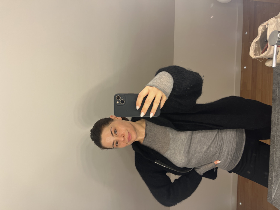 An adult female, with dark hair pulled back and a light complexion, is depicted taking a mirror selfie indoors. She is wearing a black, textured, open-front cardigan over a fitted grey long-sleeved top and black trousers. Her right hand holds a black smartphone (likely an iPhone) pointed towards the mirror, revealing white-tipped manicured nails. Her left hand rests on her hip. The reflected environment features a plain, light-colored, slightly sloped wall or ceiling in the upper background. The lower background shows a wooden floor with several recessed floor lights, a light-colored fabric bag containing various small items, and a chrome-colored fixture on a surface. A dark, possibly stone or concrete, counter is visible in the immediate foreground. The specific location within Carency, France, cannot be determined from the visual evidence.