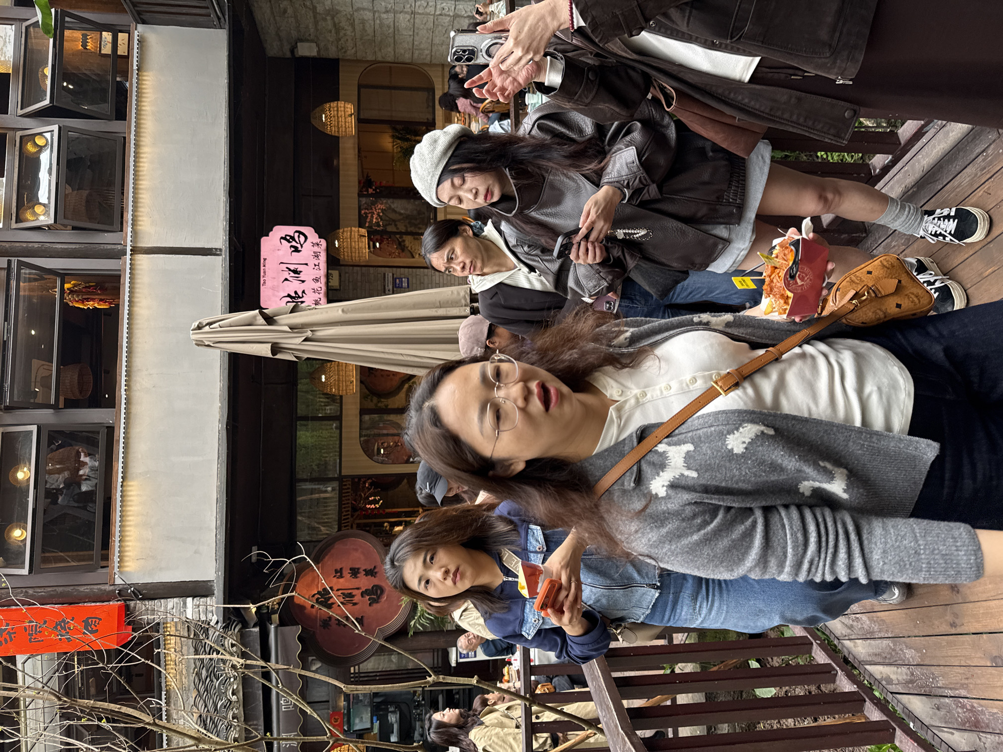 The image depicts a crowded outdoor commercial or pedestrian area within Nan'an District, China, characterized by traditional multi-story architecture and contemporary elements. The scene is illuminated by diffused daylight. In the immediate foreground, a woman with long dark hair and glasses wears a gray cardigan featuring white dog patterns over a white collared shirt, dark pants, and a brown crossbody bag. Her mouth is slightly ajar, suggesting mid-speech or a reaction. To her left and slightly behind, another woman with long dark hair wears a blue denim jacket over a light top and blue jeans. She holds an orange mobile phone in her left hand and a red paper tray containing street food, garnished with a small yellow flag, in her right hand. Her gaze is directed forward. Behind these individuals, a woman wearing a dark brown leather-like jacket, a light grey miniskirt, a light grey beret, and black platform sneakers uses a black smartphone held with both hands. She also holds a red paper tray of street food in her left hand. To her right, a partially visible individual in a dark brown jacket holds a silver smartphone aloft with both hands, seemingly capturing a photo or video. Additional people are visible throughout the mid-ground and background, some walking, others seated at tables, suggesting a bustling environment. A man with short hair is seated at a table in the background on the left. Architecturally, the scene features buildings with dark wooden frames, white plaster sections, and traditional dark tiled roofs. Open windows on upper floors reveal interior lighting and glimpses of other structures. Several Chinese language signs are present, including a vertical red banner with "古镇烧肉" (Ancient Town Roast Meat) and a circular dark brown sign, as well as a pink rectangular sign, both displaying "桃源鸣" and "桃花鱼江湖菜" (Peach Blossom Fish Jianghu Cuisine). A large, folded beige outdoor umbrella stands upright. The ground consists of a dark wooden walkway with brown railings on the left, beneath which some green foliage is visible. Bare tree branches are present on the far left. The overall activity involves people walking, consuming street food, and actively using mobile phones for communication or photography.