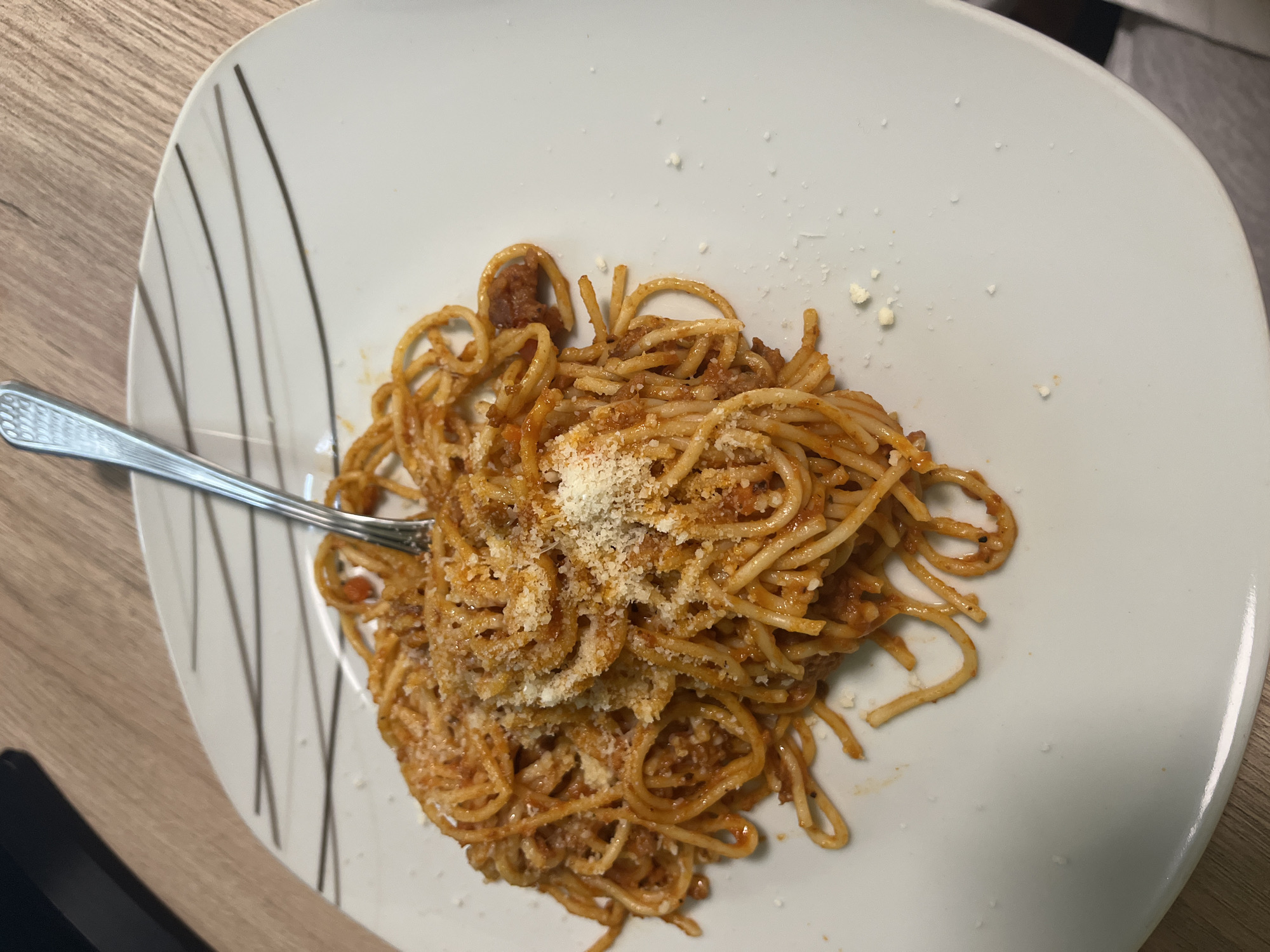 A white, rectangular dinner plate with rounded corners rests on a light brown wooden surface exhibiting a distinct grain pattern. The plate holds a serving of spaghetti coated in a reddish-brown meat-based sauce and generously topped with grated white cheese. A silver-colored metal fork, featuring a textured handle, is partially embedded in the spaghetti mass, oriented with its tines downwards. Scattered particles of white grated cheese are visible on the surrounding white surface of the plate. Four thin, black, horizontal lines decorate the upper right quadrant of the plate. The scene is illuminated by ambient indoor light. No individuals are visible. The image does not contain discernible architectural or environmental features to identify a specific location within the city of Vratsa, Bulgaria.