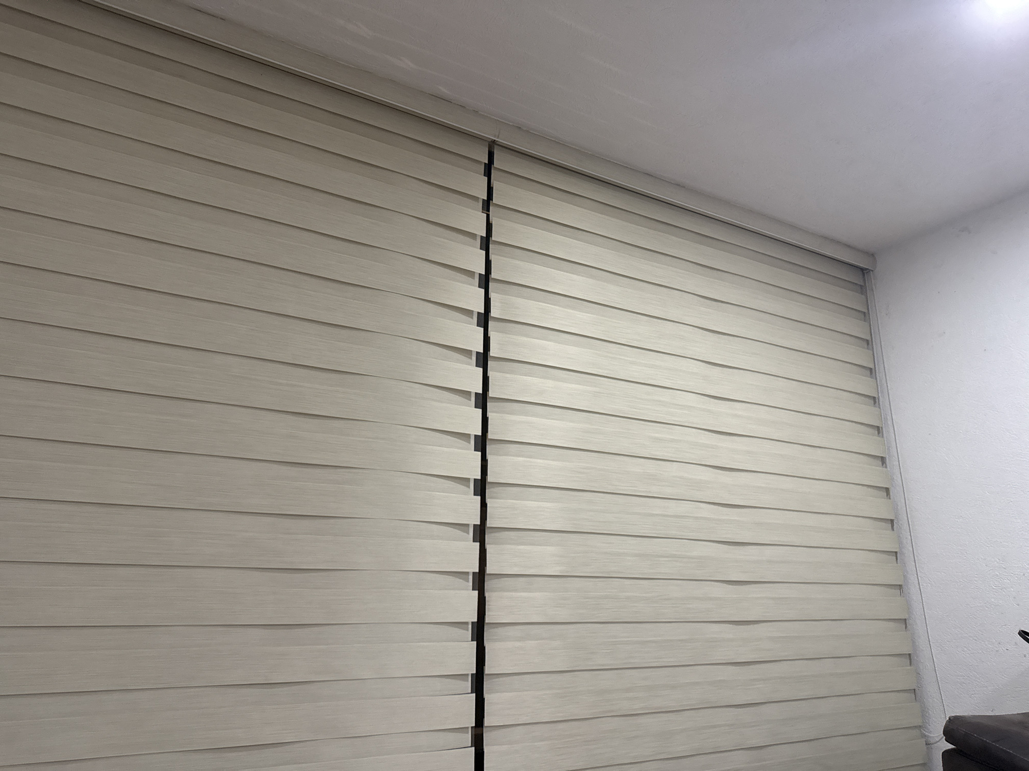 The image presents an interior view of a room, specifically focusing on a set of horizontal zebra blinds, located in Santa Clara Ocoyucan, Mexico