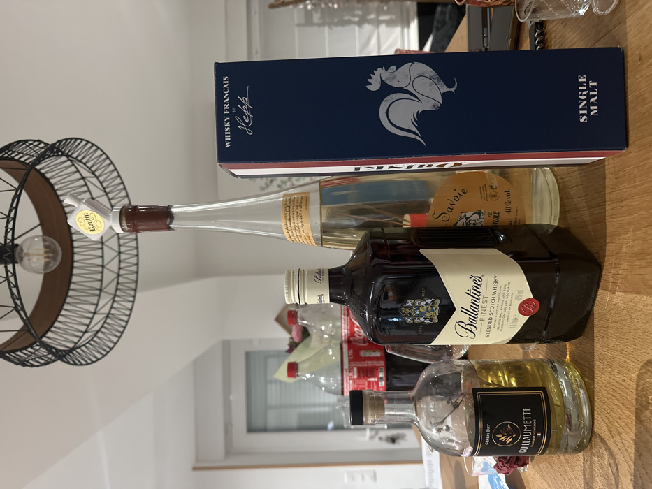 The image showcases a collection of alcoholic beverages. At the top, there's a box of "Whisky Francais by Hepp, Single Malt" featuring a rooster logo. Below, a long, slender bottle labeled "Routin Savoie" with a "Genepi Dry Guillaumette" bottle in front. A "Ballantine's Finest Blended Scotch Whisky" bottle is centrally positioned. In the background, one can notice an upside down lamp, coca-cola bottles and other glass vessels.