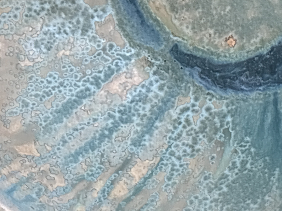The image displays a high-magnification view of an abstract, textured surface. The composition is dominated by shades of blue, teal, and beige, with areas of dark blue. Numerous circular, light-blue formations resembling frothy bubbles or crystalline structures are distributed across the field, appearing distinct from underlying smoother, pale-brown or beige areas. Diagonal streaks of lighter blue and beige suggest layering or flow patterns. A prominent, irregular, dark blue, curvilinear channel or vein traverses from the mid-right edge towards the bottom center of the frame. A small, irregular orange-brown spot is visible near the bottom right. The texture appears granular or organic. No identifiable location within Issy-les-Moulineaux, France, or any specific geographic context is discernible. No individuals, animate subjects, man-made objects (beyond the textured material itself), actions, or interactions are depicted.