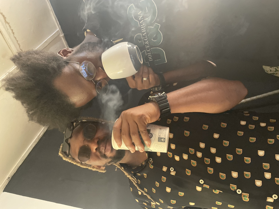 The image depicts two adult males indoors. While the context suggests a location in Jos, Nigeria, specific identifying features to pinpoint an exact location within the city are absent. The scene captures the individuals from the chest up against a dark background, possibly a wall. The male on the left has light-colored dreadlocks, a beard, and wears dark oval sunglasses, with a second pair perched on his head. He is dressed in a black short-sleeved button-up shirt featuring a repeating pattern of light-colored, half-moon shapes, and a black digital watch on his left wrist. He holds a white and green patterned disposable cup in his left hand near his face, from which a faint wisp of vapor or smoke is visible. He looks directly at the camera with a slight smile. The male on the right has voluminous, dark, upward-styled hair, a beard, and wears dark-rimmed round glasses reflecting light. He is dressed in a dark short-sleeved t-shirt with "DOLCE & GABBANA" text visible on the chest and a silver ring on his right ring finger; a necklace with light-colored beads is partially visible. He holds a white mug with a dark base in his right hand, close to his face, from which a distinct plume of vapor or smoke emanates. He is looking downwards, away from the camera. Both individuals are in close proximity, and the visible vapor suggests an activity such as vaping, smoking, or consuming a hot beverage.