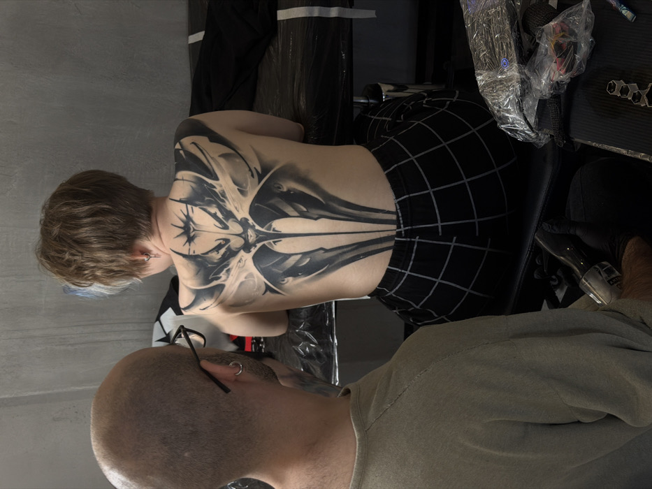 The image depicts a tattoo artist actively engaged in tattooing the back of a client within what appears to be a professional studio setting. The specific location within Moscow, Russia, cannot be determined from the image. **People:** 1. **Tattoo Artist:** A male individual, seen from behind and slightly to the left, with a mostly bald head and short brown hair on the sides. He wears black-framed glasses and a silver hoop earring in his left ear. His torso is covered by a light khaki-colored long-sleeved shirt. His gloved left hand is visible, holding a black and clear tattoo machine, positioned near the client's lower back. 2. **Client:** A female individual, seen from behind, seated and facing away from the viewer. She has short, light brown hair with a subtle blue tint visible on the left side, and a silver hoop earring in her left ear. Her upper back is exposed, displaying a large, intricate black and grey tattoo of an abstract, possibly biomechanical or gothic design, spanning her shoulder blades and extending down her spine. She is wearing black pants with a white grid or checkered pattern. **Objects:** * **Tattoo:** The central subject on the client's back is a detailed, dark-toned tattoo featuring sharp angles, wing-like elements, and a central elongated design, rendered in black and grey. * **Equipment:** The tattoo artist holds a rotary tattoo machine. To the artist's right, a black-surfaced trolley or table, covered with black plastic sheeting, holds various tattooing supplies, including wrapped tools, bottles, and a tray with hexagonal ink caps. * **Seating:** The client is seated on a padded black surface, likely a tattoo chair or bed, also covered in black plastic sheeting. A piece of black fabric (clothing) is draped on the seating surface to the client's right. **Environment:** The background consists of a plain, textured light grey wall. The overall scene indicates an indoor environment, consistent with a tattoo studio.