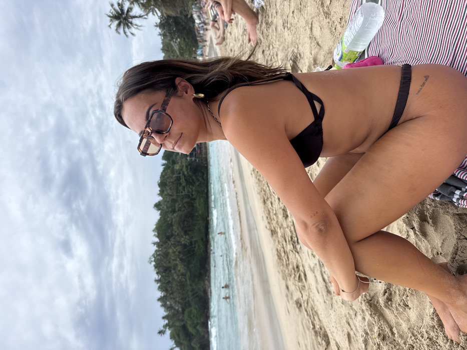 A woman in a black bikini and sunglasses sits on a striped towel on a sandy beach. Her arms are crossed over her knees, and she is looking towards the viewer. A lush, green forest borders the beach, and the ocean is calm with a few people swimming. The sky is cloudy, indicating an overcast day. A water bottle and a pink object rest on the towel near her.