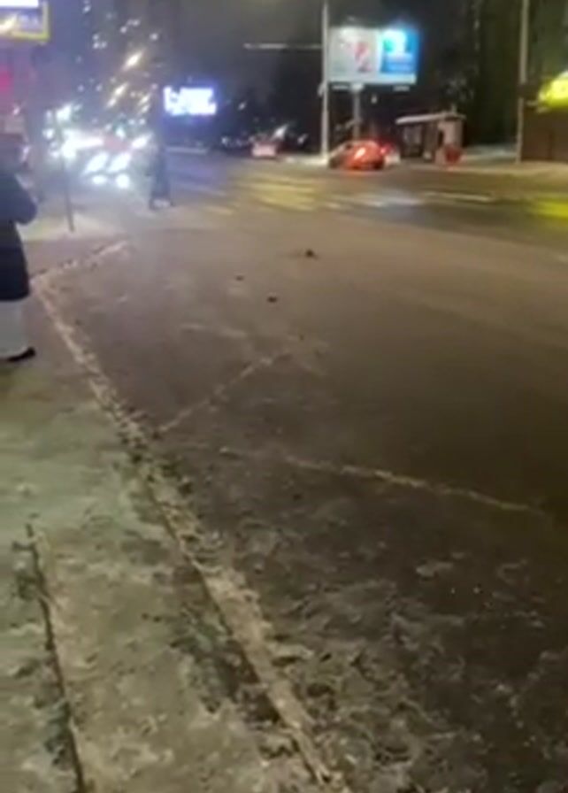 street scene at night. The road is wet and there are patches of snow on the sidewalks. There are several cars driving on the road, and a few pedestrians are waiting at a crosswalk. The traffic light is red. There are buildings and billboards on either side of the street.