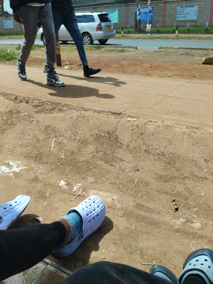 The image displays an outdoor scene in Thika Township ward, Kenya, under direct sunlight, indicated by pronounced shadows. In the immediate foreground, from a low vantage point, two feet are visible on a light brown dirt surface containing scattered small debris. The left foot, clad in a dark pant leg, wears a light blue Croc-style shoe over a blue patterned sock. The right foot, also in a dark pant leg, wears a dark blue/grey Croc-style shoe over a dark sock. Moving into the midground, two individuals are walking from left to right on a light grey concrete paved path. The person on the left wears light grey jeans and black-and-white sneakers with blue accents. The person on the right wears dark blue jeans and black shoes. Their elongated shadows are cast on the path ahead of them. Beyond the path lies an asphalt road. A silver SUV, likely a Toyota, with a rear spoiler and a visible yellow license plate, is parked facing right on the roadside. Further in the background, a concrete wall with a decorative top edge runs parallel to the road, with green foliage visible behind it. A utility pole stands beside the wall, displaying multiple signs. A prominent white rectangular sign with black text reads: "JUBILEE STATES DEPARTMENT, SOCIAL WELFARE UNIT, COUNSELLING PSYCHOLOGY, CHILD PROTECTION." Another individual is visible standing near this pole, holding a white bag.