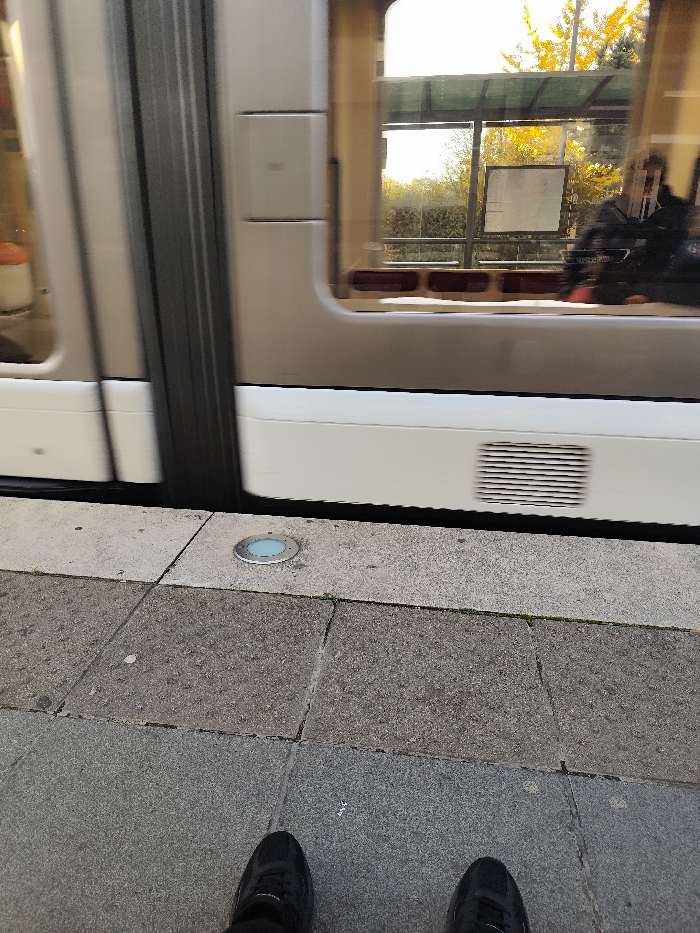 The image captures a ground-level perspective at a light rail or tram station in Hoenheim, France. In the foreground, a pair of black athletic shoes, worn by an unseen individual, rest on a grey paved platform composed of rectangular slabs. An embedded, circular ground light fixture with a light-blue luminous center is visible in the pavement between the shoes and the track. The midground and upper sections of the image are dominated by the side of a light grey and white light rail vehicle, which exhibits motion blur, indicating it is actively moving past the platform. Dark vertical lines mark a closed door seam on the vehicle, and a horizontal slatted vent is visible on its lower white section. Through the vehicle's window, reflections show a transparent shelter roof, autumnal trees with yellow foliage, and a white, blank information board. A dark, indistinct reflection of a person is also faintly visible within the right side of the window.