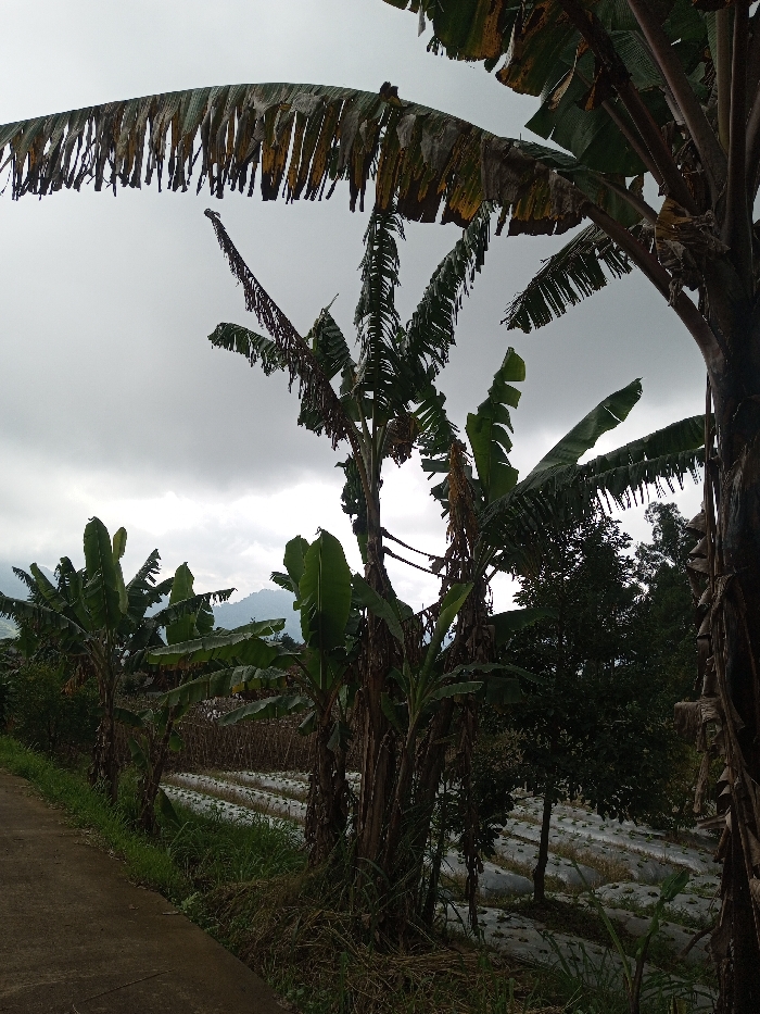 The scene depicts an agricultural landscape in the city of Kondha, India, under an overcast sky. In the foreground, the edge of a concrete or paved path runs along the lower left. Adjacent to the path, a strip of unkempt grass and low vegetation is present. Multiple banana trees with large, green, and partially dried or split leaves dominate the midground. Some banana trees display exposed brown trunks. Beyond these trees, a cultivated field extends, characterized by parallel rows covered with white plastic mulch film, under which small green plants are visible. Denser green foliage from other trees forms a darker backdrop on the right. In the far background, distant hills or mountains are silhouetted against the grey, cloudy sky. No human figures or discernible actions are present.