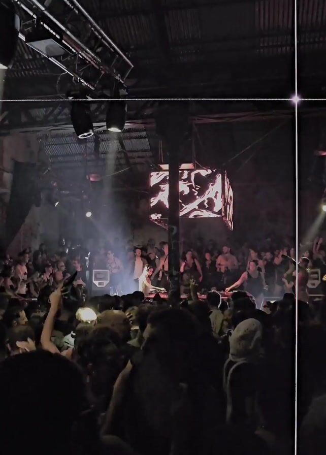 crowded dance floor at a nightclub. There is a DJ playing music on a platform in the center of the room. The crowd is diverse, with many people dancing, and some are partially undressed. The lighting is low and dramatic, with spotlights shining on the DJ and the crowd. There is a large cube hanging above the DJ with abstract images projected on it. The building appears to be an old industrial space with a corrugated metal roof and exposed beams.