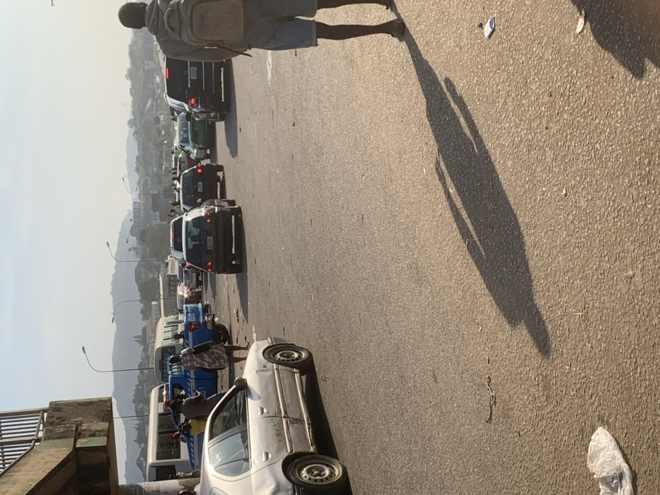A congested road presents a traffic jam. Cars are lined up, with visible brake lights indicating halted movement. People are walking on the roadside. The lighting is bright, casting long shadows of pedestrians. Mountains are visible in the distance through a hazy atmosphere. A white car is parked off to the side. Trash is scattered along the road.