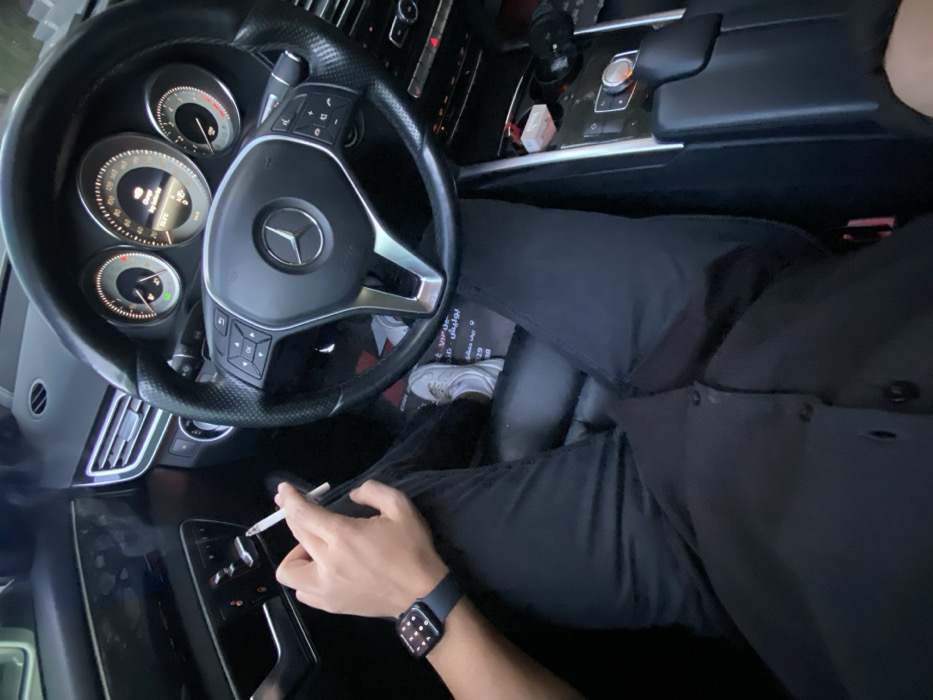The scene is contained within the interior of a Mercedes-Benz vehicle, located in the city of At-Tall, Syria. The external environment for precise geolocation within the city is not visible from this vantage point. A person's right hand, adorned with a dark Apple Watch on the left wrist, holds a lit cigarette, with faint smoke visible above it. The individual, dressed in black trousers and a black shirt, with white sneakers visible in the footwell, occupies the driver's seat. The black, perforated leather steering wheel, featuring a Mercedes-Benz emblem and integrated controls, is prominently centered. The illuminated instrument cluster includes a central digital display showing a "Warning" in English and additional text in Arabic. The left door panel exhibits glossy black trim, power window, and mirror controls. The center console contains a rotary dial, various buttons, a small white rectangular object, and a black cylindrical item. A floor mat in the passenger footwell displays Arabic text, including "Tall" and "Cafe VIP".