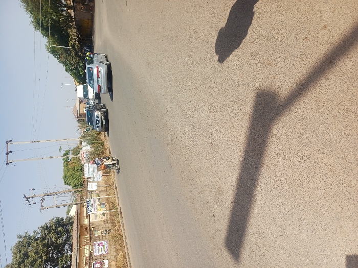 The image displays a daytime street scene in Jos, Nigeria, under a clear blue sky