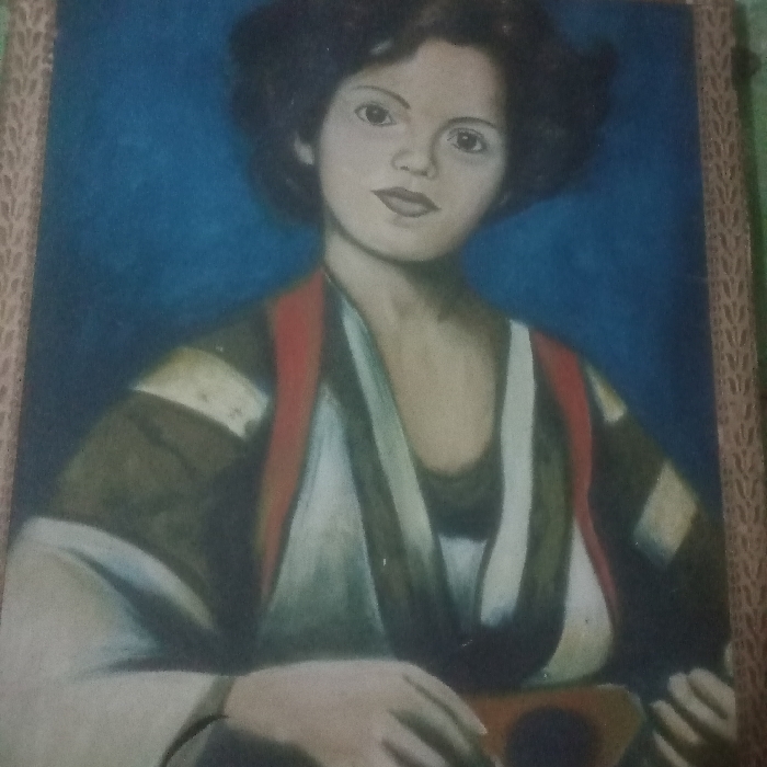 A framed portrait shows a young woman with dark, wavy hair against a blue background