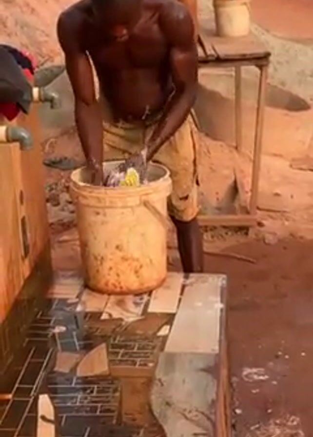 A man is washing clothes by hand in an outdoor setting. The man is dark-skinned, shirtless, and wearing khaki shorts. He is standing in front of a concrete structure with tiled walls and metal faucets, next to a tan bucket filled with soapy water. He is actively scrubbing clothes inside the bucket. Behind him is a wooden table with various containers on top. The surrounding environment appears to be a construction or work site with reddish-brown dirt and piles of sand or gravel visible. A loud engine noise can be heard.