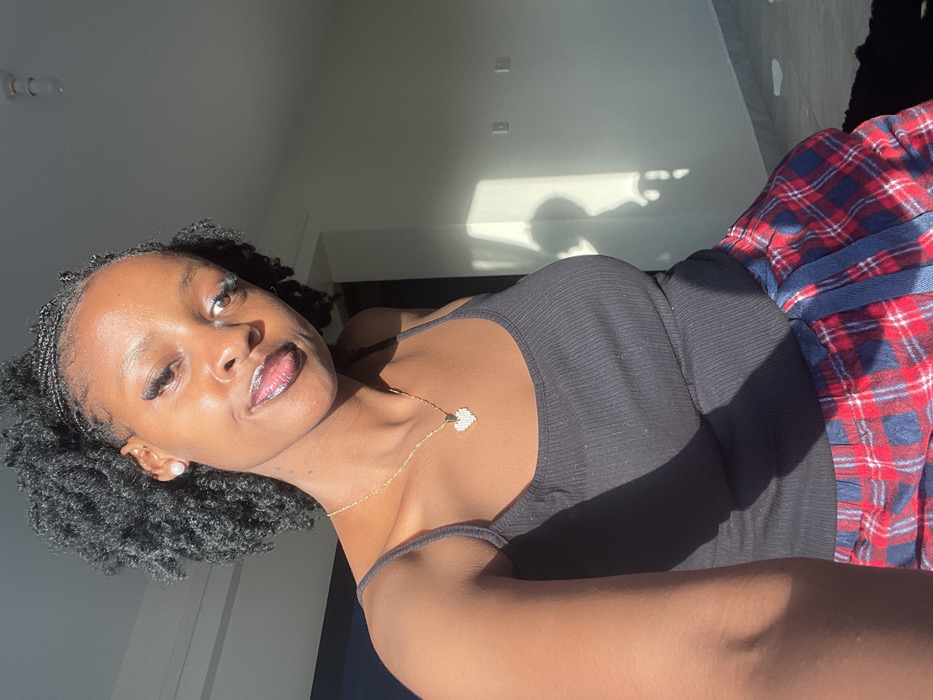 A young Black woman is centered in the frame, posing in a black tank top and plaid bottoms