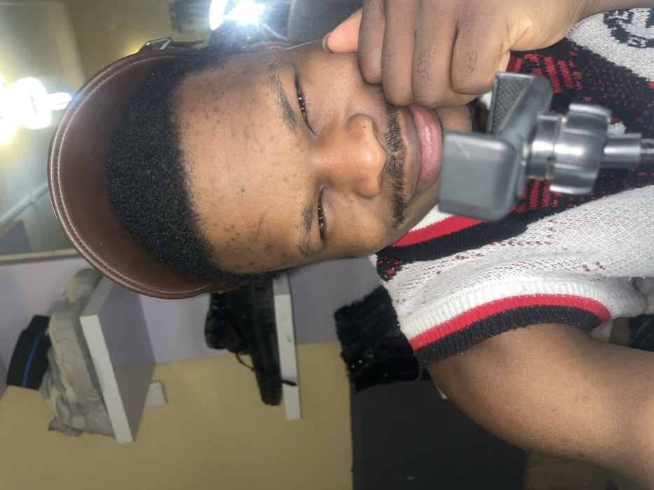 A person with dark skin, short dark hair, and a trimmed mustache is visible