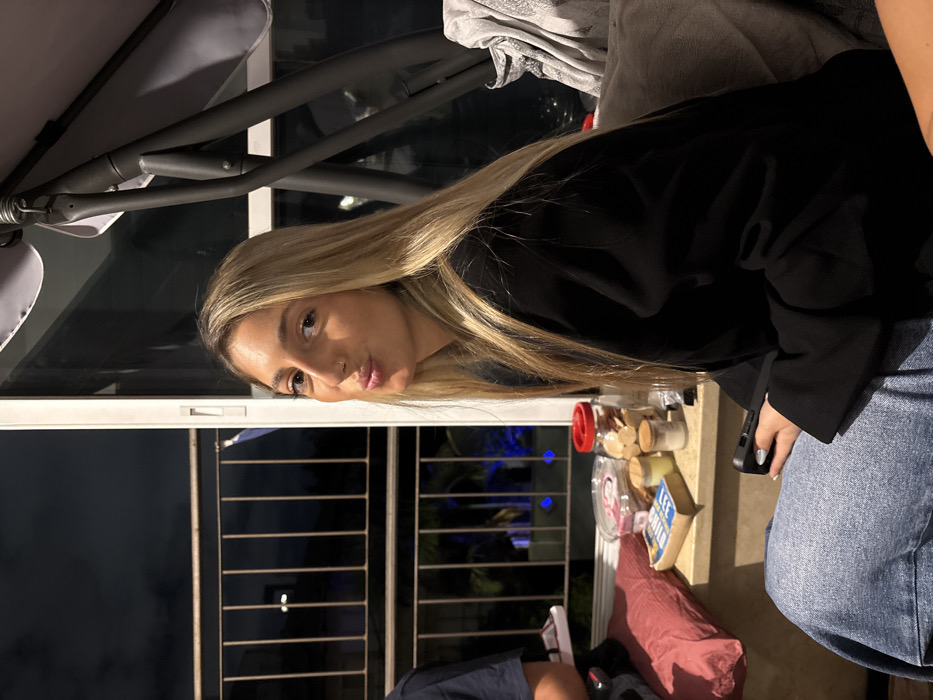 A female subject, approximately 20-35 years old, with long blonde hair, is centered in the frame, directly facing the camera with pouting lips. She wears a dark long-sleeved garment and light blue denim jeans. A small stud piercing is visible on her left nostril. Her left hand holds a black smartphone against her upper thigh, displaying white manicured fingernails. The scene is situated on an outdoor balcony in Ramat Gan, Israel, during nighttime, with a dark sky and blurred distant blue lights visible through a metal railing in the background. To the far left, a person's upper arm and shoulder, clad in a dark blue t-shirt, are partially visible. A red cushion rests on the balcony ledge. On the ledge, from left to right, are: a book with a blue and yellow cover, displaying "BILL GATES" on its spine; a clear plastic container with a red lid holding indeterminate snacks; a glass jar with a red lid filled with numerous light-colored, thin, circular dried fruit slices; two small glass jars with wooden lids; and a small black cylindrical object. On the far right, a dark gray metal frame and a light gray fabric canopy, consistent with an outdoor swing chair, are present. A portion of a glass sliding door or window is visible behind the subject.