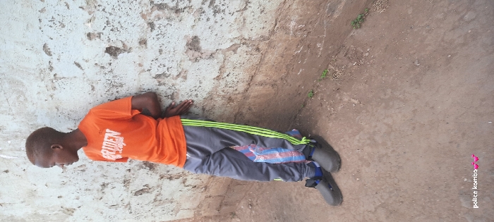 A young person lies on their stomach, appearing bound with rope or cloth. The individual wears an orange t-shirt with text, gray sweatpants with green stripes down the side, and black shoes. They are positioned against a weathered, concrete-like wall and a dirt or soil surface. The wall exhibits significant wear and discoloration. The person’s hands seem to be pressed against the wall, while their legs are bound together. A "police kombo" logo is visible in the lower right corner.