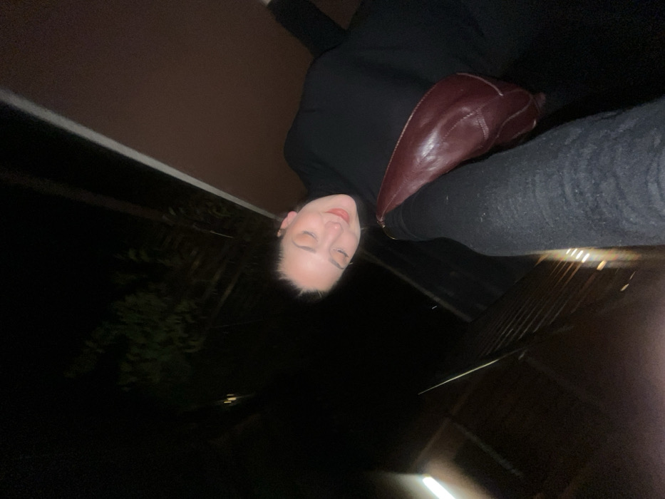 A woman with light skin and blonde hair is tilted downwards in the frame, wearing a black turtleneck sweater and dark pants. A burgundy leather bag rests against her side. The background is mostly dark, suggesting nighttime, with blurred hints of foliage and a fence. There is artificial lighting at the bottom of the frame that is blurred from the camera’s orientation.