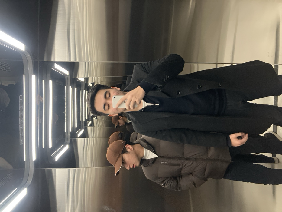 The scene is an interior view within a modern elevator located in Namangan City, Uzbekistan. The elevator walls are constructed from highly reflective, polished metallic panels, which create multiple, recursive reflections of the enclosed space and its occupants. The ceiling contains several parallel, rectangular LED light fixtures, casting bright illumination and contributing to the reflective visual effect. Two male individuals are present. In the foreground, positioned to the right, a man with dark hair wears a dark long coat over a dark blue half-zip sweater and a white undershirt. He is holding a white smartphone in front of his face, partially obscuring it, in the action of taking a mirror photograph. To his left and slightly behind him, a second male with dark hair wears a brown baseball cap and a brown puffer jacket over a white long-sleeved shirt. This individual is turned to his left (the viewer's right), looking away from the primary reflection, with his hands appearing to be in his pockets. Their reflections are visible in the background, repeating the scene.