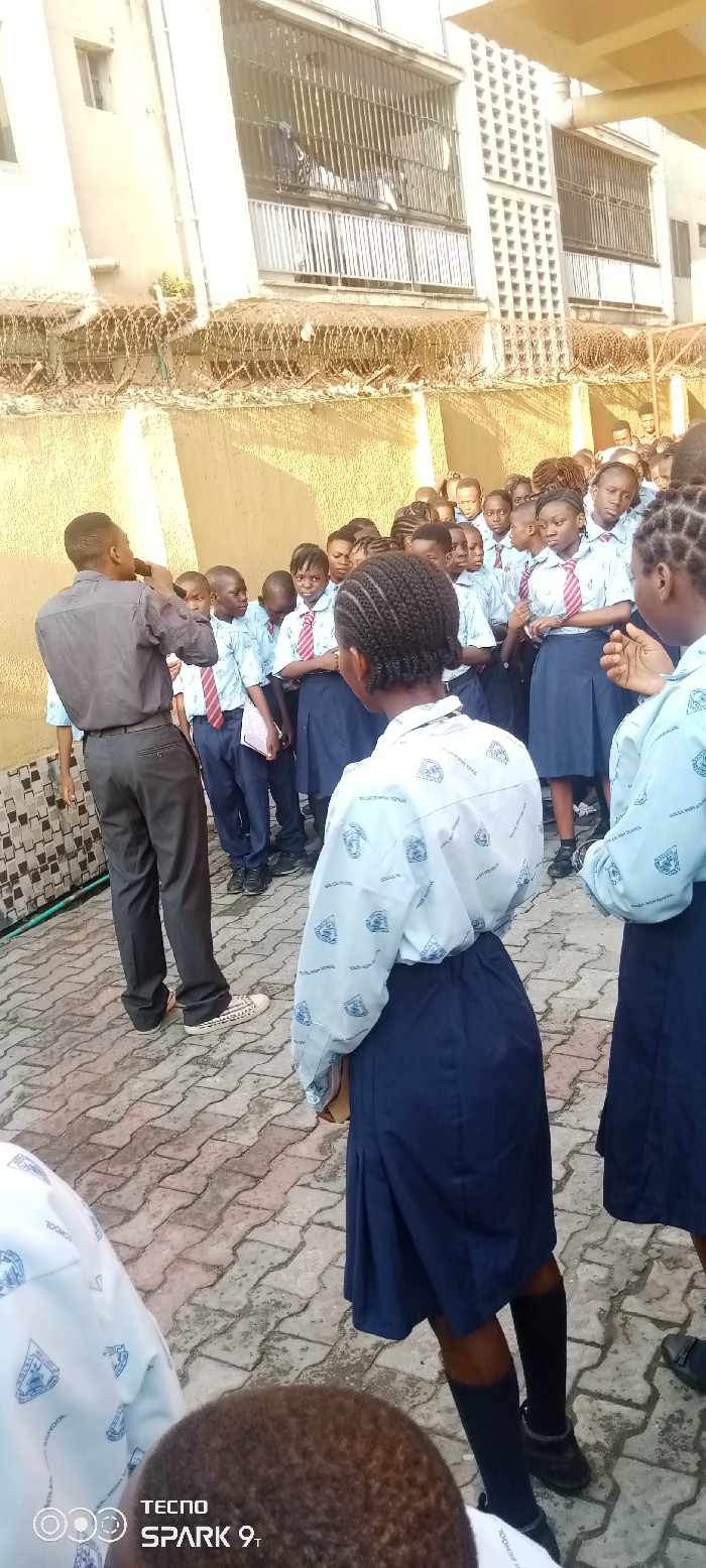 A group of students in matching school uniforms stand on a paved area, listening to a man who faces them and holds what appears to be a microphone. The students wear white shirts with a school emblem and dark blue skirts or trousers. The man is dressed in dark trousers and a gray shirt. A building with barred windows and barbed wire on the wall is in the background. The camera captures the scene from a slightly lower angle, with some students partially visible in the foreground.