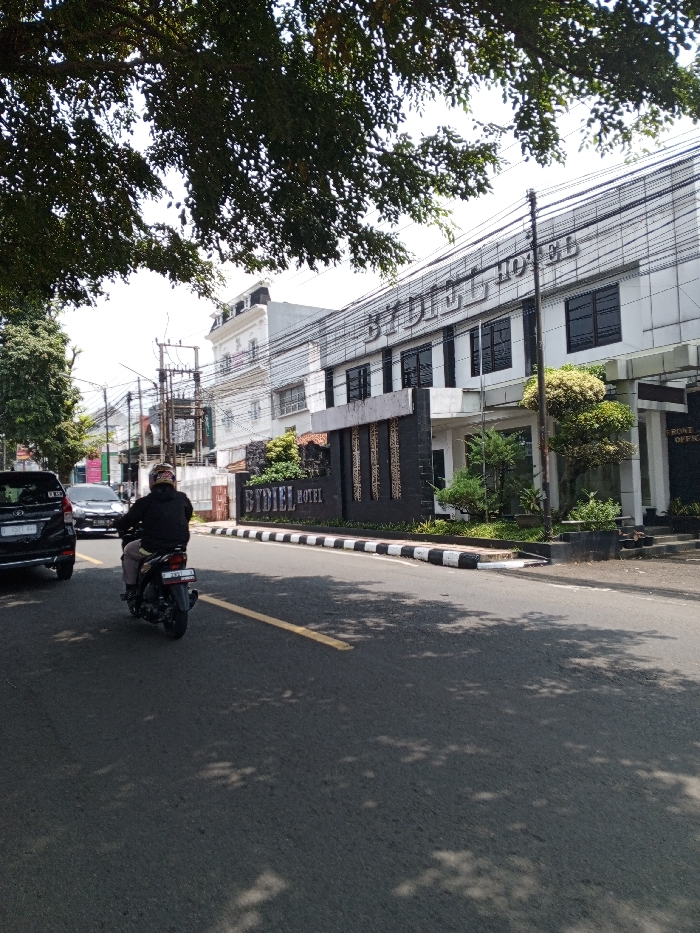 The image displays a sunny daytime urban street scene in Multhan, India. A person wearing a black jacket and a full-face helmet is seen from the rear, riding a black scooter on an asphalt road that features a partial yellow dividing line. The scooter's rear license plate is partially visible, starting with "D 59...". To the immediate left of the scooter, a black SUV is parked or moving slowly, bearing the license plate "D 1521 MH". Further down the street, a silver car is visible. On the right side of the road, the "SYDIEL HOTEL" is a prominent multi-story white building with multiple dark-framed windows. A large, dark-colored sign displaying the hotel's name in white lettering is situated at ground level, accompanied by landscaped greenery. The hotel property is delineated from the road by a black and white striped curb. Utility poles supporting numerous overhead wires are visible along the street, particularly on the left side. Tree foliage partially obscures the upper left corner of the image and casts distinct shadows across the sunlit asphalt road, indicating bright daylight conditions.