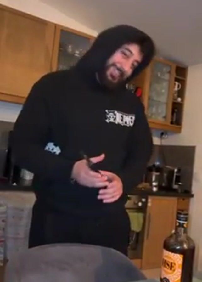 A person wearing a black hooded sweatshirt and black pants stands in a kitchen