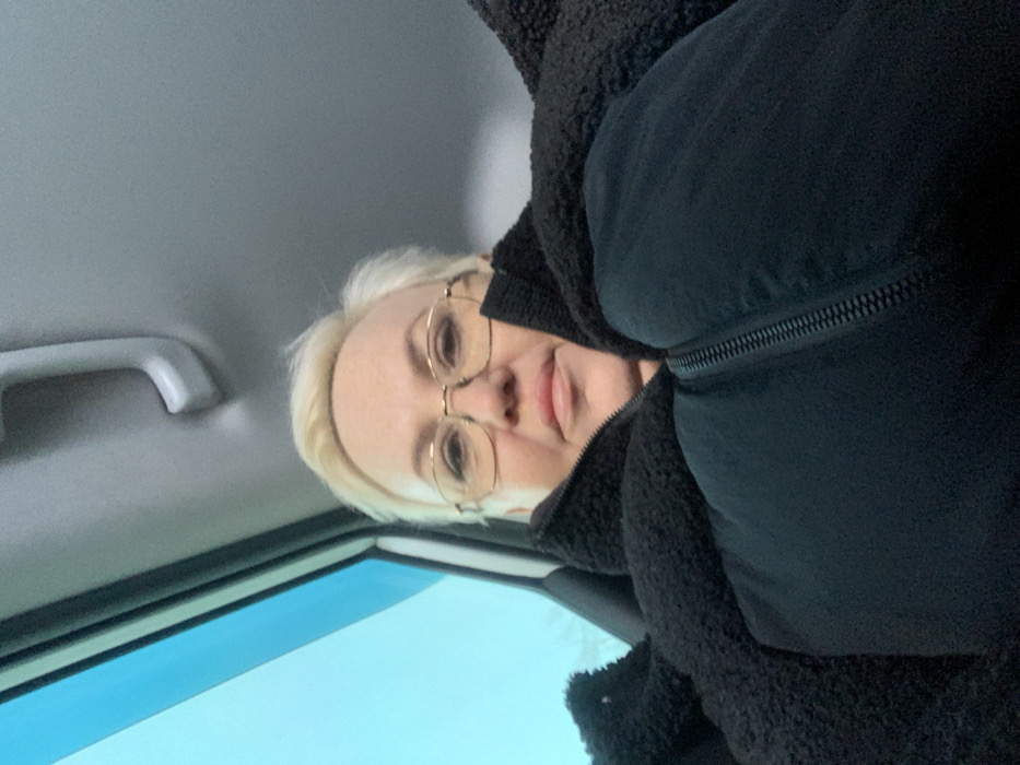 - "A low-angle selfie captured inside a vehicle depicts an adult female with short, light blonde hair and gold-rimmed eyeglasses" by FM-7g2oI2, licensed under CC BY 4.0