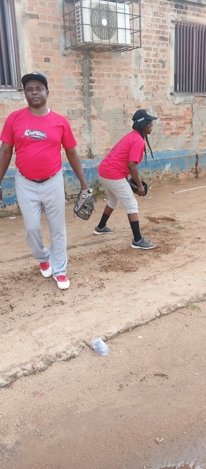 An outdoor scene in Lagos, Nigeria, depicts two individuals on an unpaved dirt field next to a weathered reddish-brown brick building. The building features a caged OMAH-branded air conditioning unit mounted on the wall and a window secured with vertical metal bars. A horizontal blue stripe is painted along the lower portion of the brick wall. The ground is uneven, composed of packed earth with visible foot traffic patterns. On the left, a dark-complexioned male wears a red t-shirt emblazoned with "BASEBALL SOFTBALL FIESTA," light grey baseball pants, a dark baseball cap, and red and white cleats. He holds a beige Wilson brand baseball glove on his left hand and is captured in mid-stride, walking towards the viewer's left. His expression is neutral. To his right, a dark-complexioned female with long dark braids wears a similar red t-shirt, light grey capri-style baseball pants, dark socks, and grey athletic shoes. She wears a black baseball cap featuring the word "LEGACY" in white. She is in a crouched, ready stance, holding a dark baseball glove on her left hand, positioned as if fielding a ball. A small, crumpled clear plastic bag, containing indistinct contents, rests on the dirt ground in the lower right foreground. Both individuals are equipped for and engaged in baseball or softball activities.