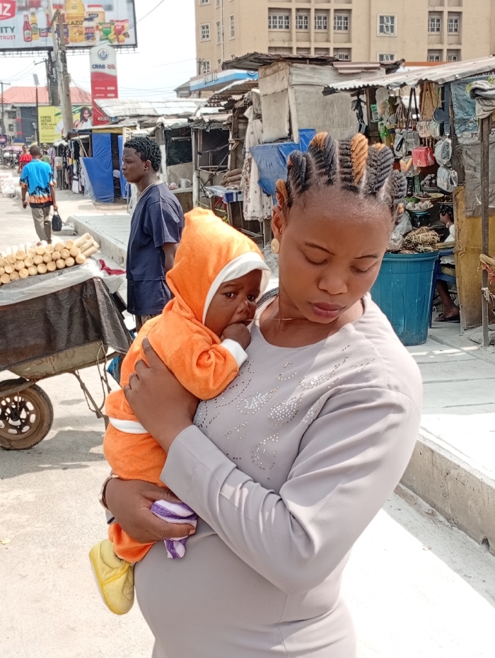 A woman holds a baby in an orange outfit. The woman wears a grey dress with a studded pattern and has a unique braided hairstyle with light brown streaks. They are outdoors on a bustling street with market stalls and people in the background. A cart filled with what appear to be potatoes is visible nearby. Buildings are seen in the distance.