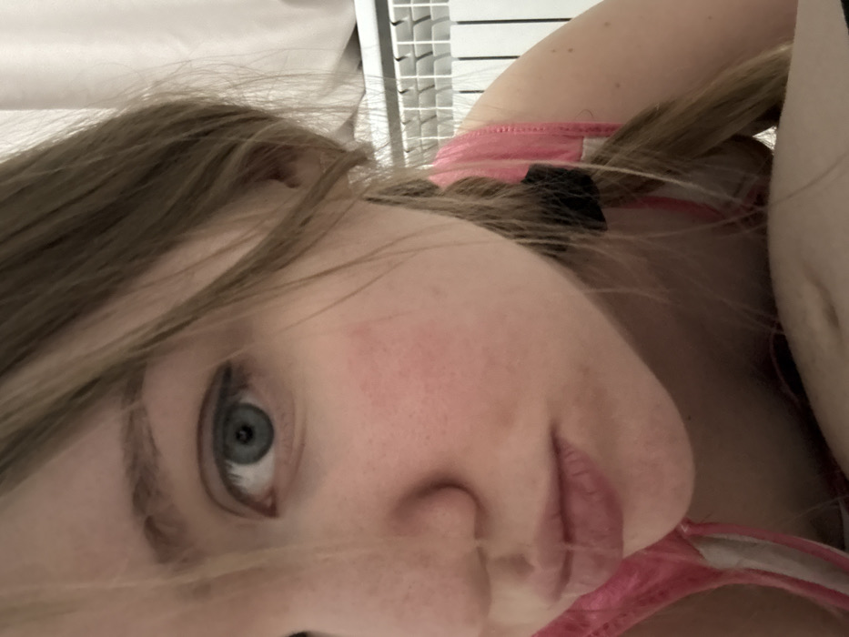 A fair-skinned young woman with blue eyes is the focus, her face tilted and close to the camera. She has light brown hair, some strands falling across her face, while the rest is partially braided with a black hair tie. She is wearing a pink top. Blinds are visible in the background. The image is slightly rotated and angled, providing a casual, intimate perspective.