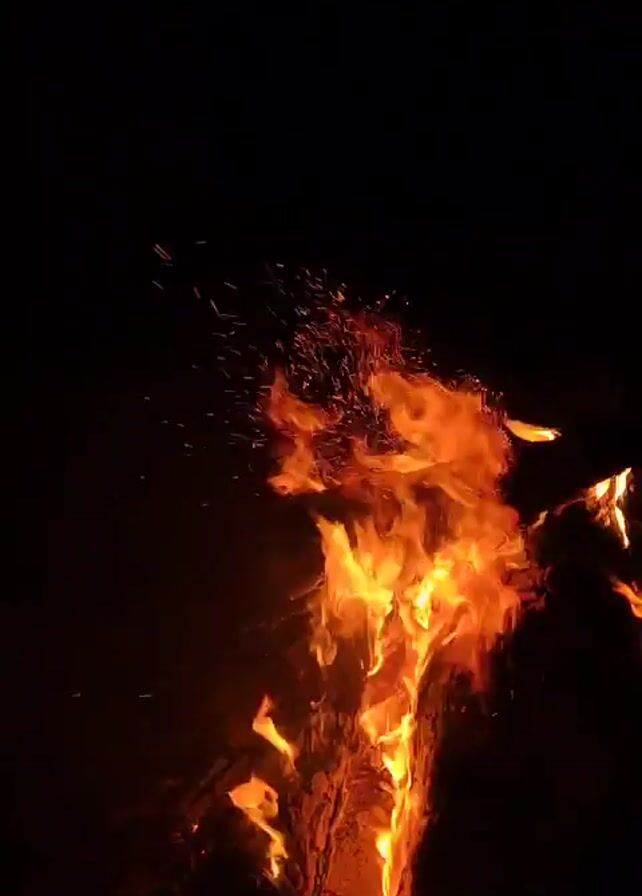 campfire at night, with flames rising from burning logs, accompanied by sparks flying into the air. Voices can be heard in the background.
