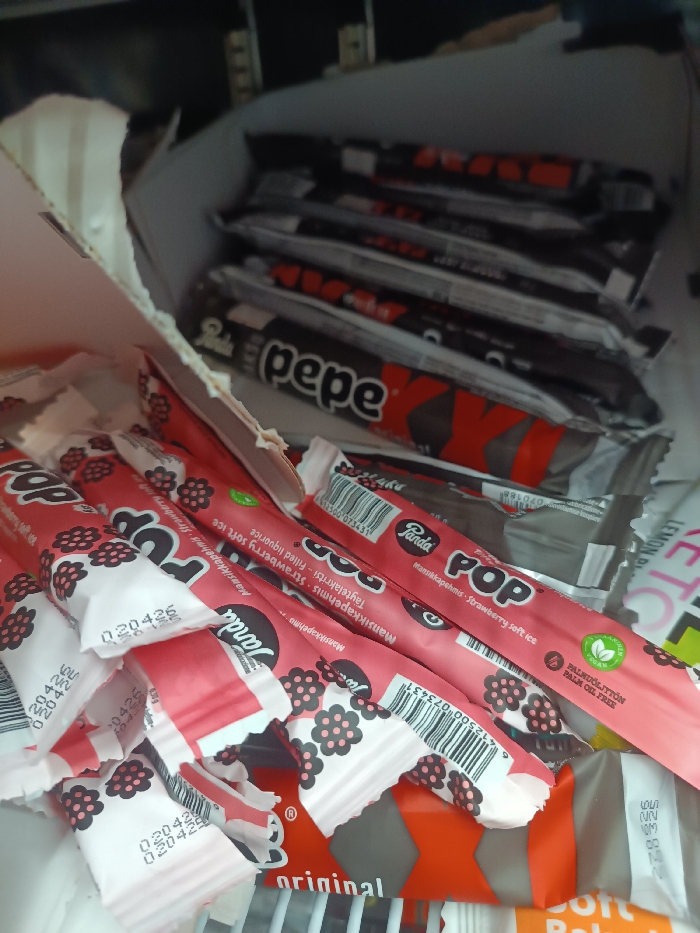 The image depicts an interior view of a retail display container filled with various packaged confectionery products. In the foreground, a stack of multiple "Panda Pop" brand items are visible, individually packaged in predominantly pink and white wrappers. These packages are labeled with "Mansikkapehmis - Strawberry soft ice" and "Täytelakritsi - Filled liquorice," displaying a small black floral pattern, a green "VEGAN" symbol, and "PALMUÖLJYTÖN PALM OIL FREE" text. White labels with numerical codes, such as "020426," and barcodes are present on these packages. In the background and beneath the foreground items, numerous "pepe" brand confectionery packages are stacked, distinguishable by their black/grey wrappers featuring a prominent red "XY" or "XX" logo. Other partially obscured packaging includes text elements such as "LEMON" and "original." The confectionery is contained within a light-colored display box exhibiting visible wear and torn edges. No individuals or actions are present in the scene. The location is the city of Unknown, Unknown.