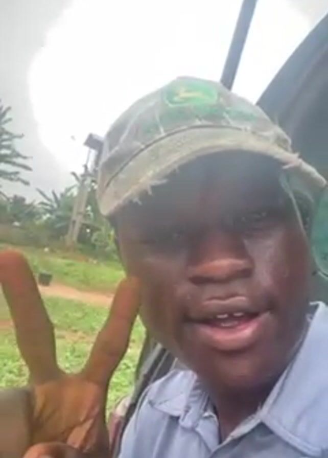 A young man, likely in his late teens or early twenties, is taking a selfie video while sitting in what appears to be a vehicle. He is wearing a light blue button-down shirt and a faded green cap with a John Deere logo. He holds up his left hand, displaying a peace sign or the number two. Behind him, the background reveals a rural or agricultural setting with green vegetation, possibly banana trees, and a raised wooden structure that could be a watchtower or observation post. The sky is overcast, suggesting it may be raining or cloudy. The man is looking directly at the camera and talking, possibly addressing an audience or making a statement related to agriculture or the location he is in.
