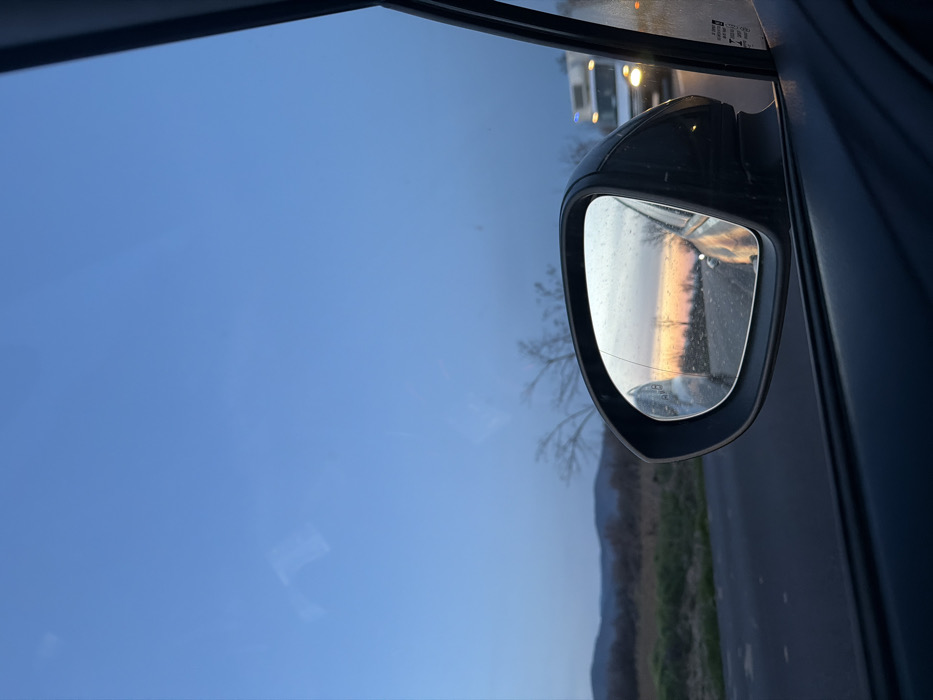 The image depicts an exterior view from the passenger side of a moving vehicle in Dalboki, Bulgaria, during twilight hours. The upper sky is a clear, deep blue, transitioning to a vibrant orange and pink horizon, indicative of sunset. A paved road is visible in the lower left, bordered by green and brown vegetation and leafless trees. Distant, dark hills are present on the horizon. The vehicle's black-framed side mirror is centrally positioned in the lower frame, its glass appearing smudged and displaying a prominent crack on the left side. The mirror reflects the colorful horizon, bare trees, and a trailing vehicle. Through the main passenger window, a large white truck or van with illuminated headlights is visible on the road behind the observer's vehicle, positioned towards the right side of the frame. No individuals are directly visible.