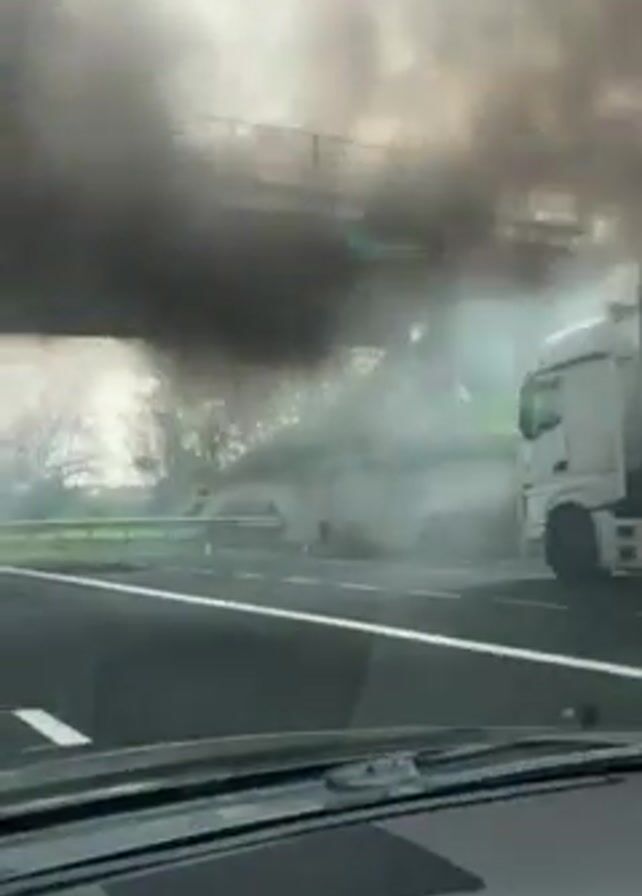 car on fire on a road, likely a highway, as seen from another vehicle. Large flames and thick black smoke billow from the burning car. The road has lane markings and appears to be relatively flat. The sky is overcast.