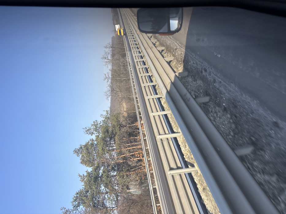 The image depicts a multi-lane highway near Rajana, Bulgaria, on a clear, sunny day, likely in late winter or early spring. The perspective is from inside a moving vehicle, evidenced by the partially visible side mirror on the right and a dark vertical frame on the right edge, suggesting a window. In the foreground, a gray metal guardrail runs parallel to the direction of travel, with a narrow, unpaved shoulder scattered with gravel and sparse dry vegetation between the guardrail and the paved road. The midground features a divided highway with two lanes visible for opposing traffic. Another set of gray metal guardrails separates these lanes from the foreground, and similar guardrails line the far side of the highway. A yellow van is observed driving in the distance on the opposing lanes, followed by a white semi-truck or large white vehicle. The road surface appears dark asphalt with white lane markings. The background shows a treeline with predominantly coniferous trees (pines) on the left side, appearing green, interspersed with deciduous trees that have bare branches or sparse brown foliage. Further in the distance, a lower forested or hilly landscape is visible under a clear, bright blue sky.