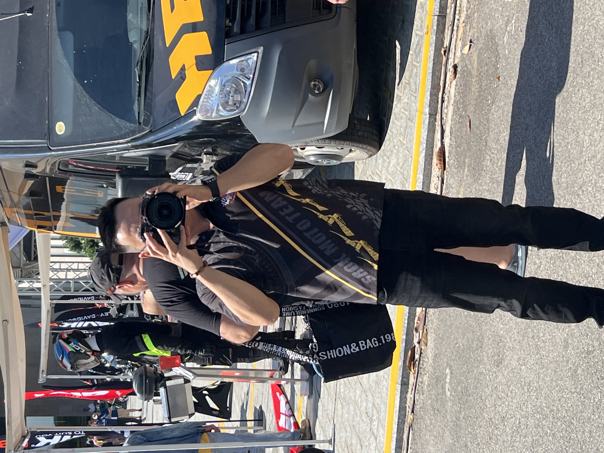 The image captures an outdoor event in Cam Ranh, Vietnam. In the central foreground, a male individual of East Asian descent, dressed in a black polo shirt with yellow accents and "SROK MOTO TEAM" lettering, and black trousers, holds a black DSLR camera with a prominent lens to his face, actively taking a photograph. He wears a black wristwatch on his left wrist and a beaded bracelet on his right wrist. A black shoulder bag with "FASHION & BAG.1989" in white text hangs from his left shoulder. Behind the photographer and slightly to his left, a mannequin is visible, wearing black motorcycle gear with a bright green stripe and a multi-colored helmet (blue, red, green, white). This display is situated under a white tent structure with promotional banners, some displaying "HARLEY-DAVIDSON" and "TO SUIT YOU" text. Further in the background, other individuals are visible, including one on the far left in a blue denim jacket. To the right of the central figure, the front portion of a black commercial van with yellow lettering on its hood is parked. The van's windshield is visibly dirty, and a small yellow sticker is present on its upper right corner. The ground consists of asphalt with clear yellow lines painted along a curb, where several dried leaves are scattered. The scene is brightly lit by natural sunlight, casting shadows. A modern building with reflective windows is partially visible in the distant background.