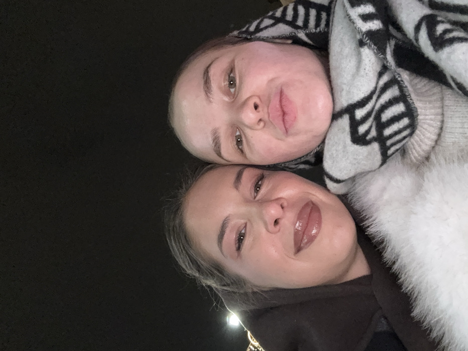 Two women pose close together, tilted upward against a black background. The woman on top wears a white sweater and a grey and black patterned scarf. The bottom woman wears a dark brown jacket with a fuzzy white collar. Both women have light skin and appear to be wearing makeup, especially glossy lip color. A blurred light and decoration can be seen in the lower left corner.
