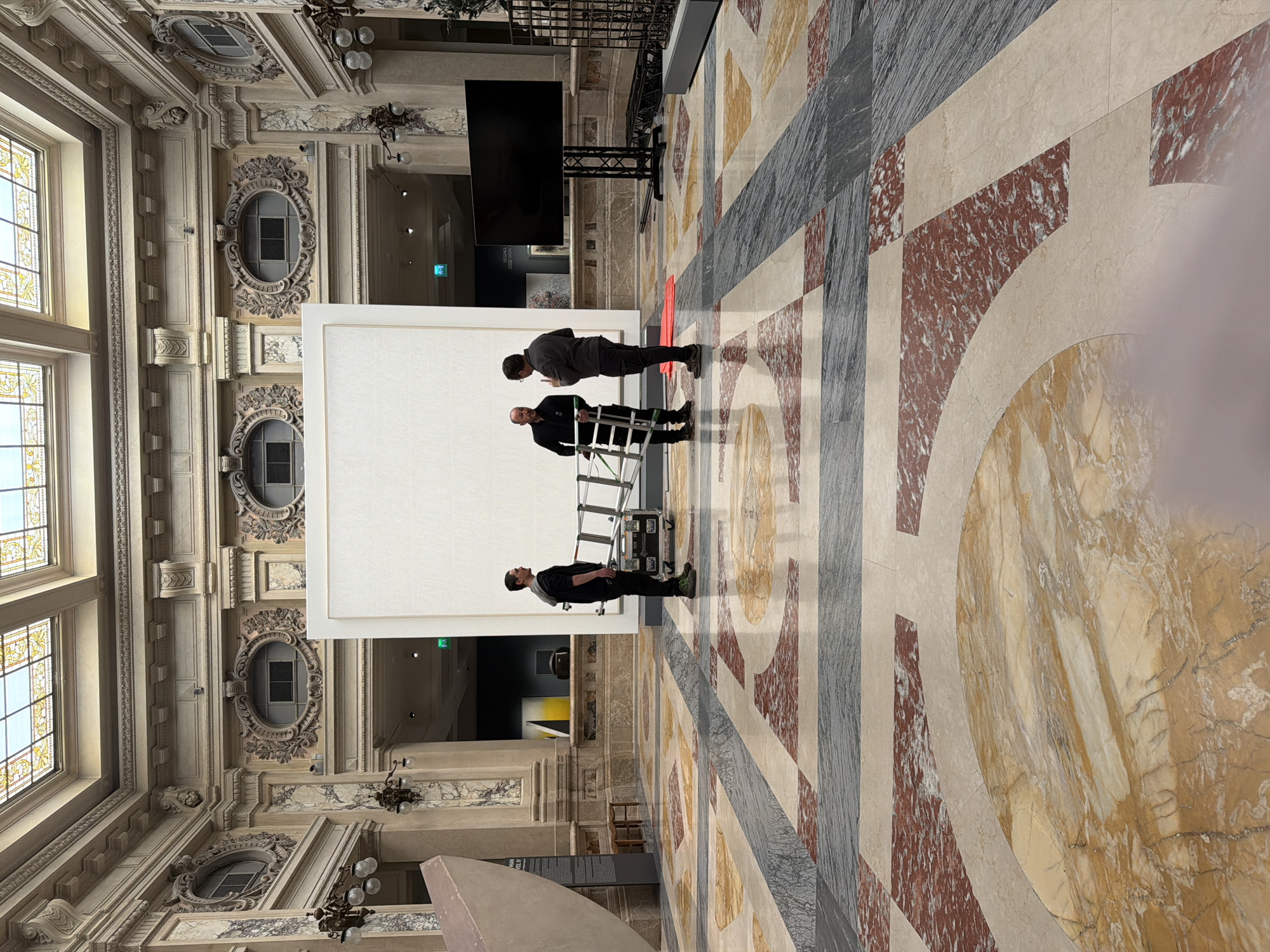 The image depicts a grand interior hall, identifiable as a large exhibition space within the Museo del Novecento in Milan, Italy. The setting features ornate classical architecture: high ceilings with a prominent stained-glass skylight in geometric patterns of yellow and clear glass, and walls adorned with pilasters, decorative friezes, and polished marble paneling incorporating several oval, gridded windows with carved surrounds. The floor is an intricate geometric mosaic of polished marble in red, grey, cream, and yellow-brown tones. Three adult males are present in the foreground/midground, all dressed in dark work attire. The man on the left, in a black hoodie and dark pants, stands observing the others. The central man, wearing a black shirt and dark pants, holds a silver aluminum step ladder horizontally, resting it on a grey wheeled equipment case, and faces the man on the right. This third man, in a dark grey shirt and dark pants, wears glasses and gestures with his left hand as if in conversation, indicating an interaction related to work coordination. In the background, a large, tall, white rectangular panel or screen stands centrally. To the far left, a substantial light-colored geometric sculpture leans, accompanied by a black information panel and a small wooden bench. To the right, a large black flat-screen display on a truss stand is visible, alongside additional dark metal truss components and a partial metal grid structure. A green illuminated exit sign is visible in the deeper background, where other contemporary artworks are vaguely discernable. The scene suggests an ongoing setup for an exhibition or event.