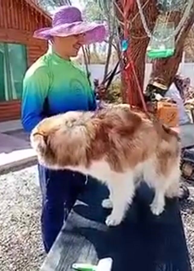 A person wearing a lavender hat and a green, blue, and purple long-sleeved shirt is grooming a large, fluffy dog on a black table outdoors. The dog is mostly brown and white. The person is using clippers to trim the dog's fur. In the background, there's a small wooden building with a window, a tree decorated with red and blue rope, and some other objects including what appears to be a generator. The scene seems to be taking place in a yard or garden area on a sunny day.
