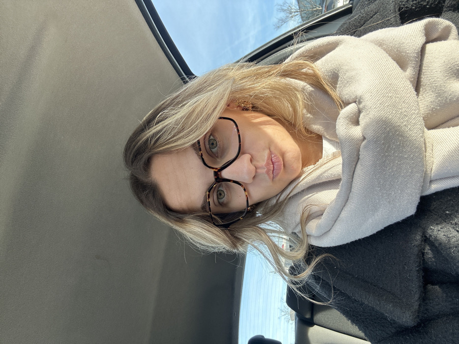 A fair-skinned adult female is depicted in a front-facing selfie taken inside a vehicle