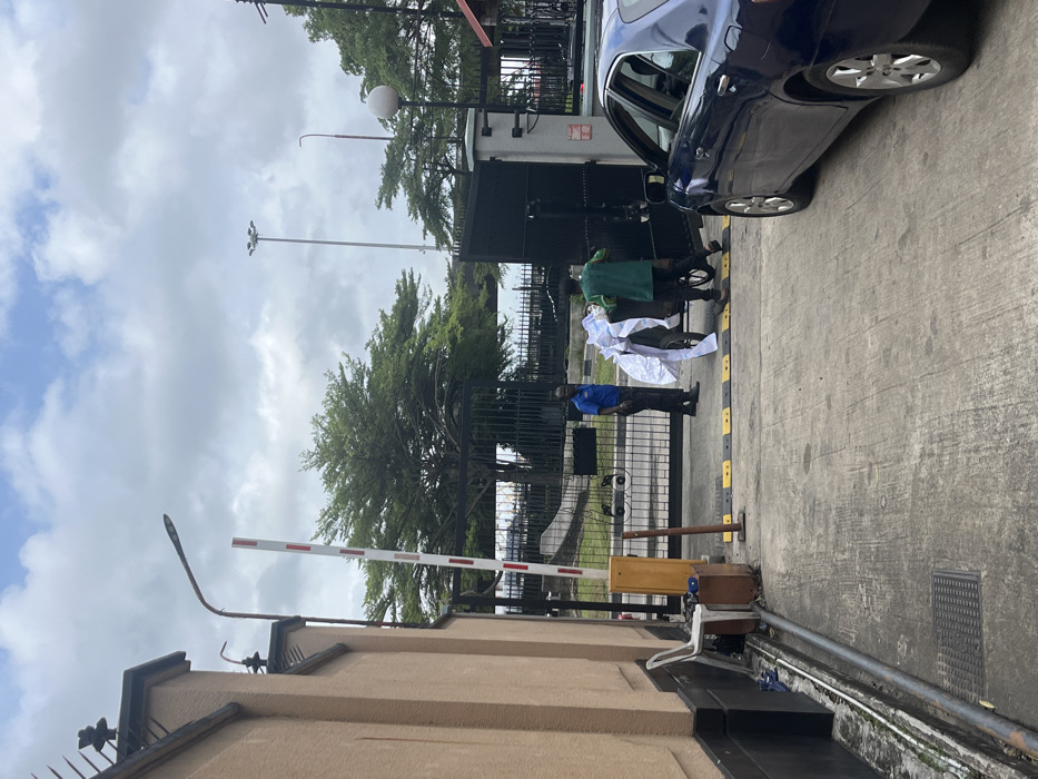 The image displays an outdoor scene at a gated entrance to a property in Lagos, Nigeria, under an overcast sky