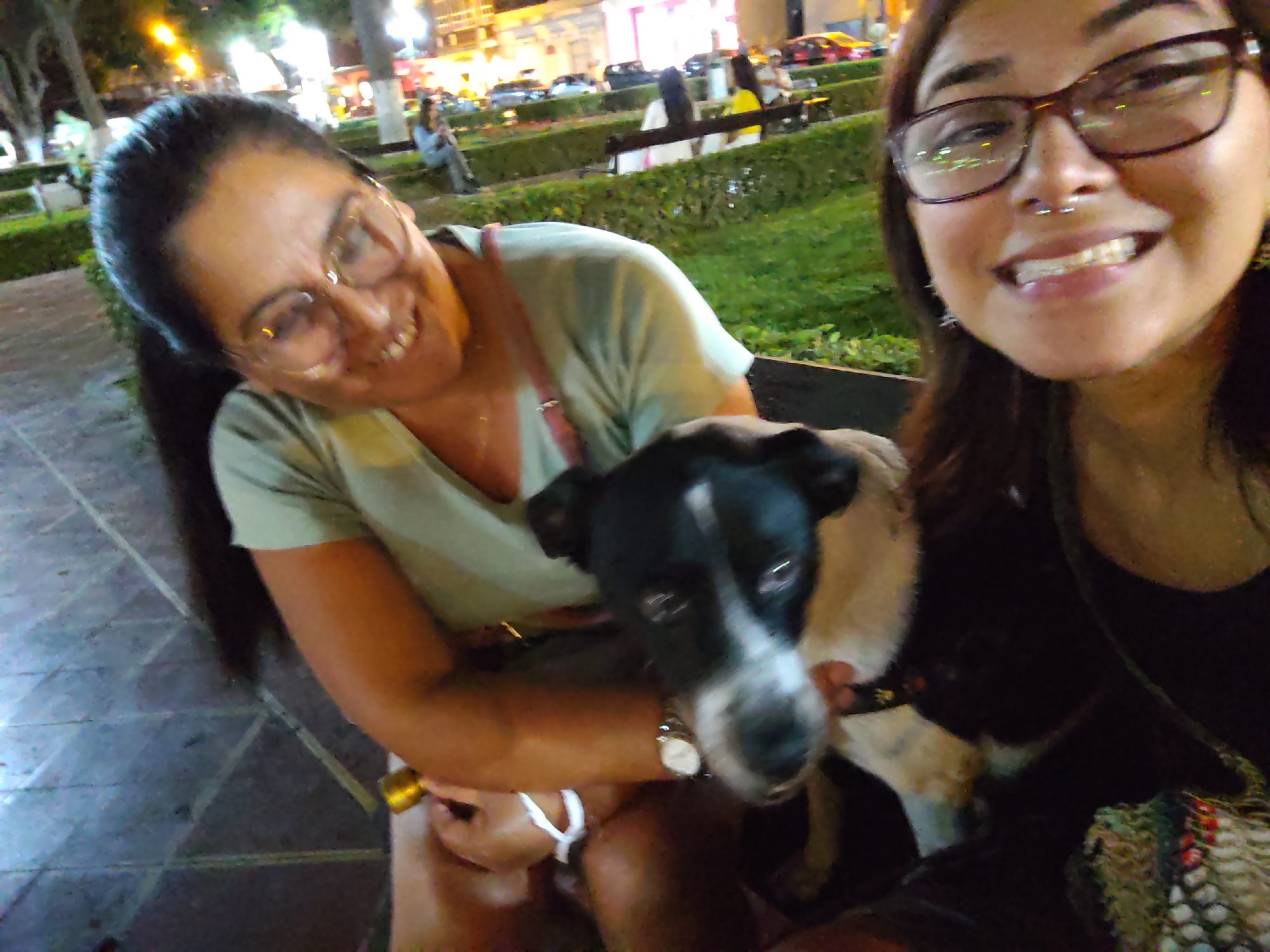 Two smiling women pose for a selfie with a black and white dog in an outdoor setting. The woman on the left wears glasses and a light green t-shirt, while the woman on the right also wears glasses and a darker top. The dog is held between them. The background shows a park or public area with benches, manicured hedges, and people sitting. The lighting suggests it is evening or nighttime. Based on the architecture, style of the park, and the city details visible, the location appears to be in the city of Barranco, Peru.