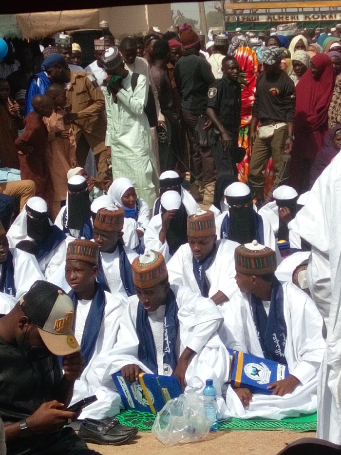 The image depicts a crowded outdoor public gathering in Tudun Murtala, Kano, Nigeria, with a visible building sign reading "ALHERI KOKAI" in the background