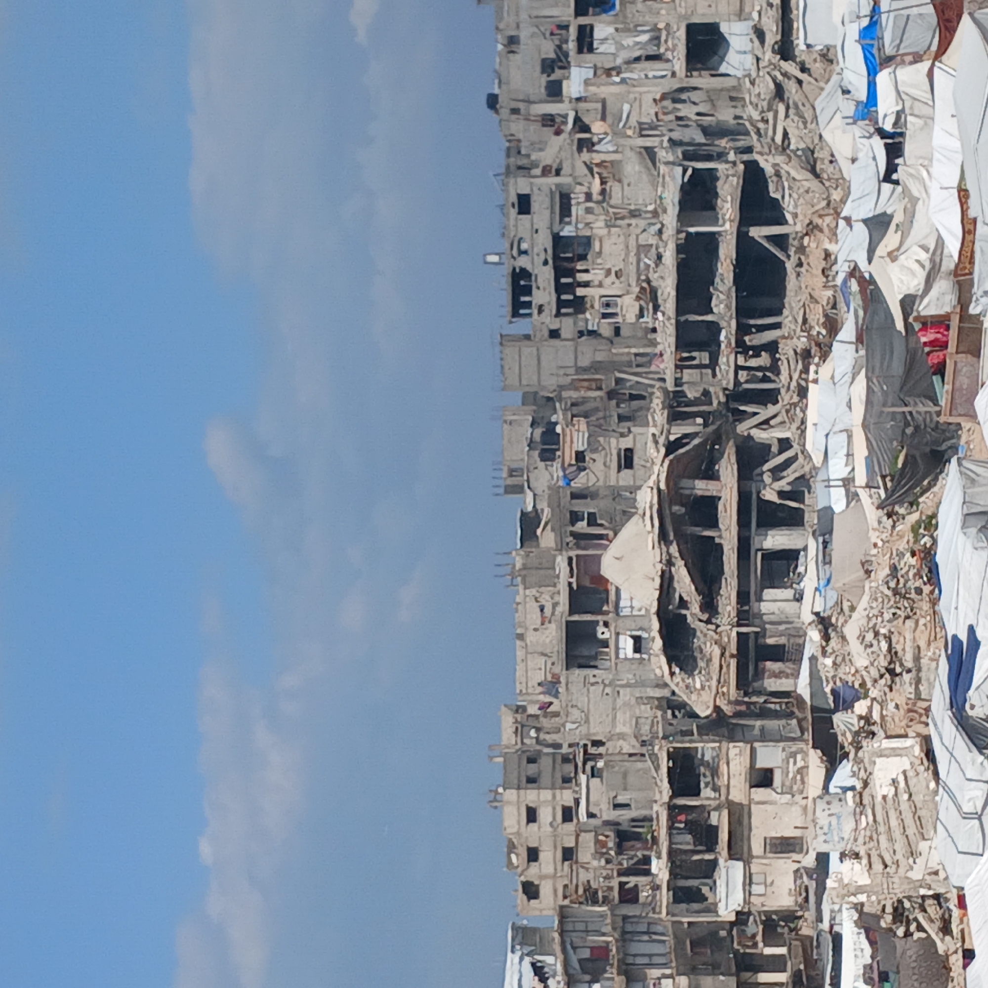 The image depicts severe destruction in what appears to be an urban environment, likely in the city of Gaza, Palestinian Territory. The buildings are heavily damaged, with many appearing structurally unsound and partially collapsed. Debris and rubble are widespread. Adjacent to the damaged buildings are numerous white tents, suggesting displacement and a makeshift refugee camp. The sky above is blue with some cloud cover. No people are clearly visible in the image.