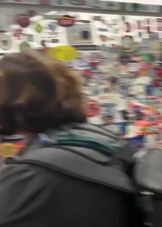 The video depicts the interior of a store with a wall covered in stickers